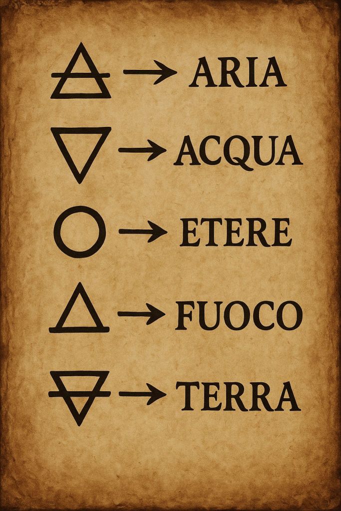 Nella lettura iniziatica, questi cinque elementi descrivono un percorso di evoluzione interiore: dal pensiero (Aria) alla profondità emotiva (Acqua), dall’unificazione (Etere) all’affermazione dell’identità (Fuoco), fino alla realizzazione nel mondo reale (Terra).